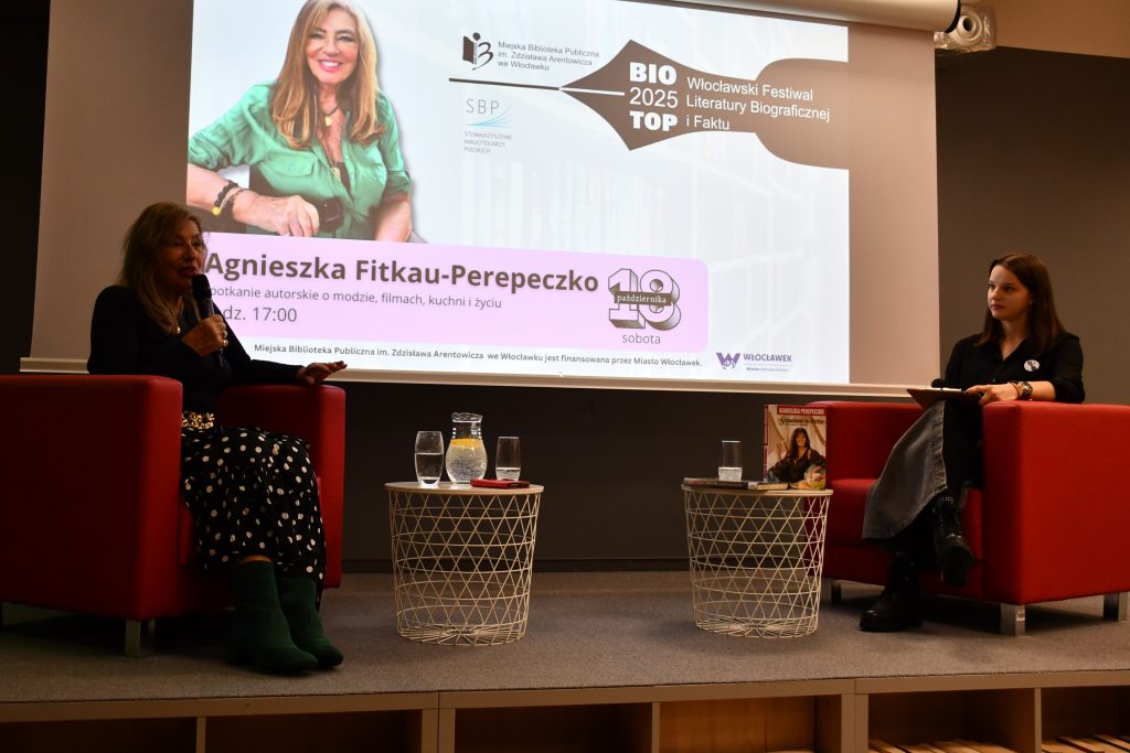 Sobotnie spotkanie zakończyło Włocławski Festiwal Literatury Biograficznej i Faktu BIO TOP 2025. Agnieszka Fitkau-Perepeczko opowiedziała o swoich doświadczeniach jako pisarka, aktorka i modelka. Nie zabrakło barwnych opowieści pełnych humoru i wzbudzających refleksję. Wspominaliśmy także wizytę państwa Perepeczko w KMPiKu, który znajdował się w budynku naszej Biblioteki.