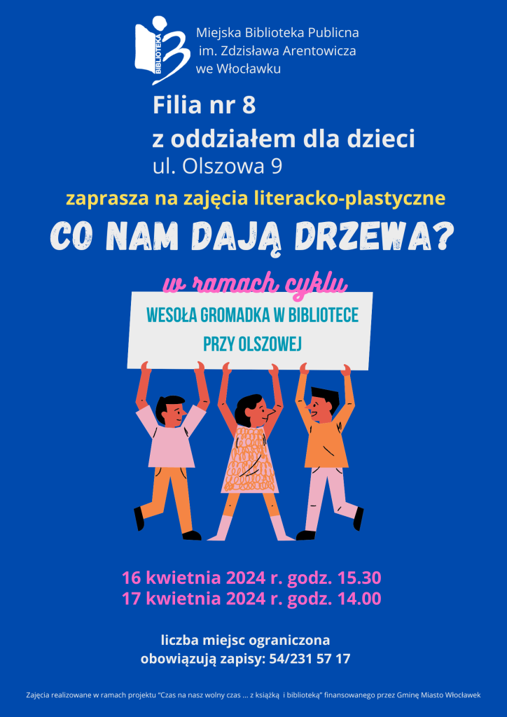 Filia nr 8 z oddziałem dla dzieci przy ul. Olszowej 9 zaprasza na zajęcia literacko-plastyczne pt.”Co nam dają drzewa?” w ramach cyklu: „Wesoła gromadka w bibliotece przy Olszowej” organizowanego w ramach projektu „Czas na nasz wolny czas… z książką i biblioteką” finansowanego przez Gminę Miasto Włocławek.