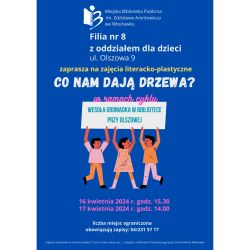 Filia nr 8 z oddziałem dla dzieci przy ul. Olszowej 9 zaprasza na zajęcia literacko-plastyczne pt.”Co nam dają drzewa?” w ramach cyklu: „Wesoła gromadka w bibliotece przy Olszowej” organizowanego w ramach projektu „Czas na nasz wolny czas… z książką i biblioteką” finansowanego przez Gminę Miasto Włocławek.