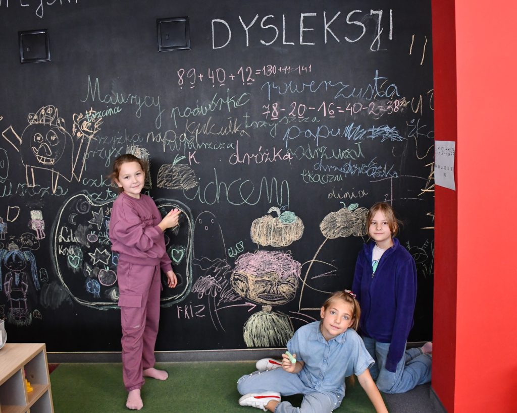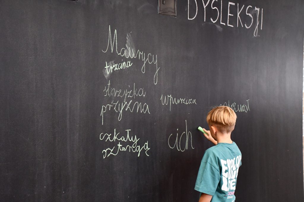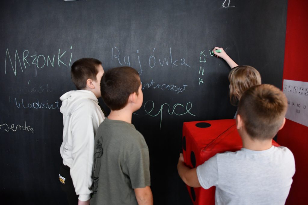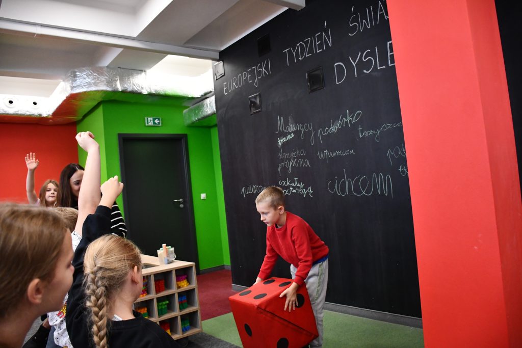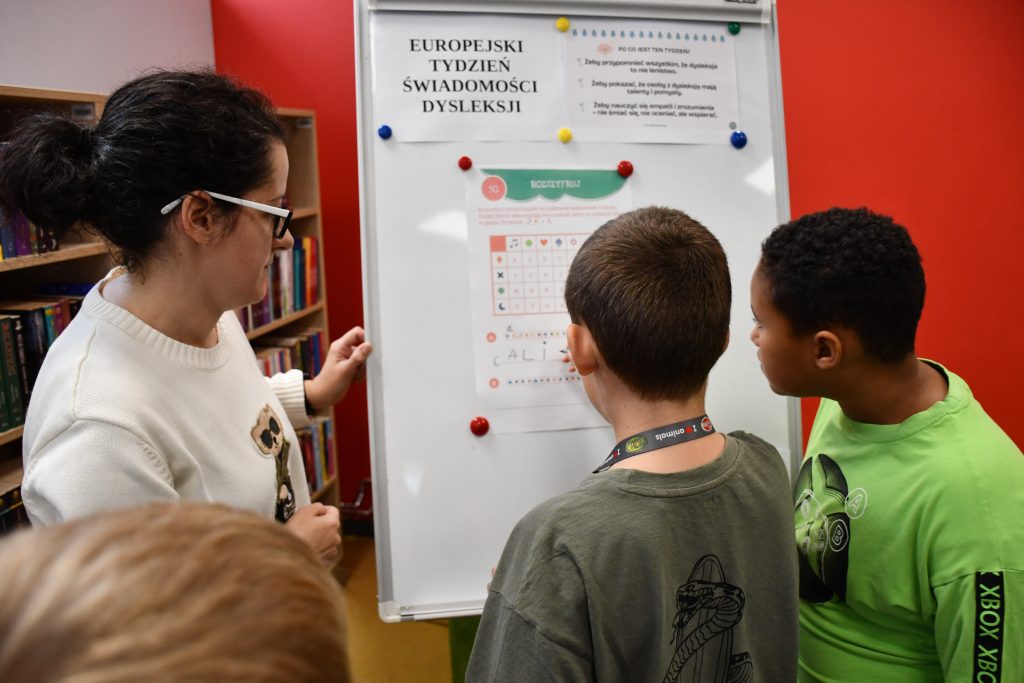 W bibliotece trwa Europejski Tydzień Świadomości Dysleksji. Podczas zorganizowanych zajęć w Strefie Dziecka rozmawiamy o trudnościach w czytaniu i pisaniu i praktycznie mierzymy się z językiem polskim. Na początek głośne czytanie wierszyków z książeczki „Logopedyczne prztyczki” M. Strzałkowskiej, a następnie pisanie ze słuchu na ściance kredowej. Ponadto zabawy z językiem, kodowanie i sylabizowanie z kostką XXL oraz bajkowe pudełko z zagadkami.