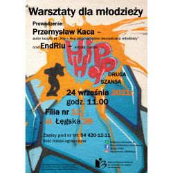 Już w najbliższy piątek w Filii nr 11 przy ul. Łęgskiej 11 odbędą się super warsztaty muzyczno – taneczne dla młodzieży. Zajęcia poprowadzą Przemysław Kaca – autor książki „Hip – Hop jako narzędzie resocjalizacji młodzieży”, oraz EndRiu – artysta/muzyk. To już ostatni dzwonek, aby się zapisać, ilość miejsc ograniczona. A więc 24 września, godzina 11.00, Filia nr 11 🙂.