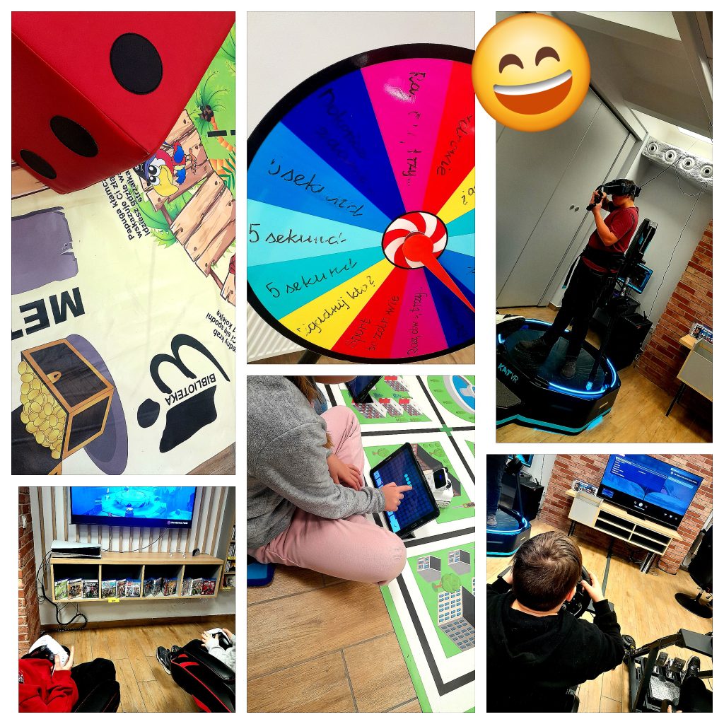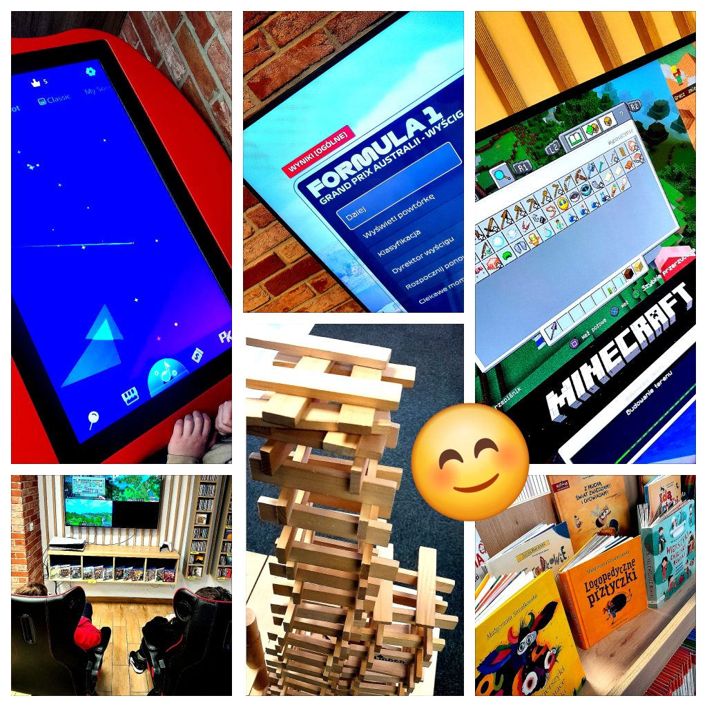 czytaniu książek, słuchaniu audiobooków, Robotach Codey Rocky, Grach na konsolach PlayStation 5, a na nich … Minecraft, Sackboy, Fifa Fc26, Gran Turismo, Formuła 1, Lego 2K, It takes two, Roblox, układaniu klocków LEGO, zabawach z Gapiszonem, zakręconym robaku, teatrzyku Kamishibai, Kinomanii, Chuście Klanza, grze wielkoformatowej, tworzeniu biżuterii z koralików, kolorowym kole fortuny, Turnieju FC26, lepieniu potworków z modeliny, grach na stoliku multimedialnym, bieżni VR i słynnym Rollercosterze, wielkich budowlach z kloców Jenga, układaniu puzzli, magicznym dywanie, karaoke i tańcach na scenie.