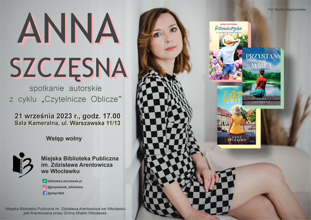 21 września zapraszany na kolejne spotkanie autorskie z cyklu „Czytelnicze Oblicze”. Tym razem gościem biblioteki będzie Anna Szczęsna, urodzona we Włocławku autorka powieści obyczajowych i opowiadań grozy. Obecnie mieszka w Toruniu. Z wykształcenia i zawodu bibliotekarka, teraz skupiona wyłącznie na pisaniu. Nagrodzona Laurem Prezydenta Miasta Włocławek za całokształt twórczości. Jest autorką ponad 20 powieści; akcja „Przystani nad Wisłą” dzieje się głównie we Włocławku; jej najnowsza powieść to wydane w czerwcu „Lato z Ritą”.