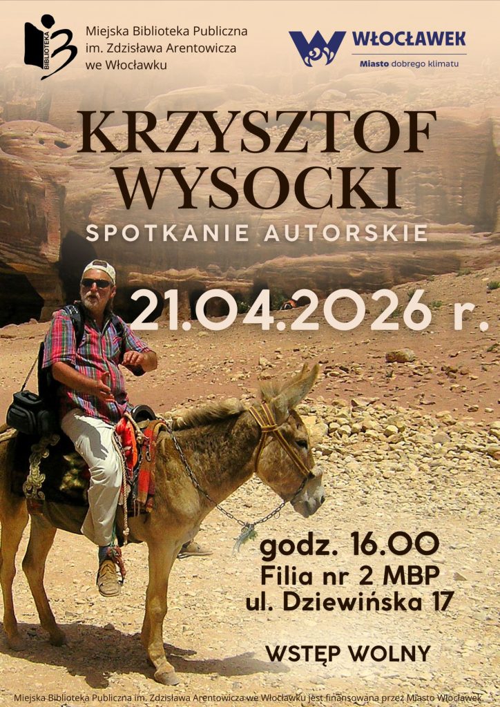 Filia nr 2 Miejskiej Biblioteki Publicznej we Włocławku zaprasza na spotkanie autorskie z Krzysztofem Wysockim – podróżnikiem pochodzącym z serca Kujaw. Autor zwiedził samodzielnie ponad 70 krajów na niemal wszystkich kontynentach. Rozmowa będzie poświęcona jego książce pt. „W poszukiwaniu drogi”, w której autor dzieli się refleksjami z wypraw, doświadczeniami oraz przemyśleniami.