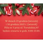 W dniach 23 grudnia (wtorek) i 30 grudnia 2025 r. (wtorek) Filia nr 3 przy ul. Toruńskiej 87 będzie otwarta w godz. 8:00-15:00.