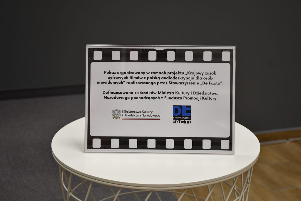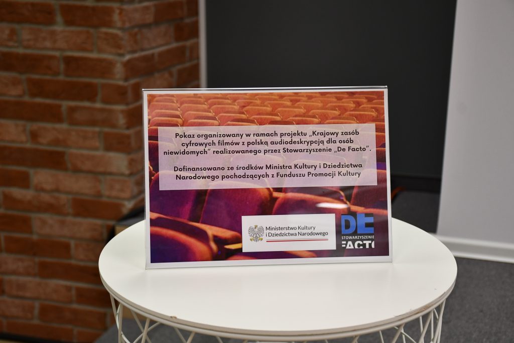 Pokaz organizowany w ramach projektu „Krajowy zasób cyfrowych filmów z polską audiodeskrypcją dla osób niewidomych” realizowanego przez Stowarzyszenie „De Facto”. Dofinansowano ze środków Ministra Kultury i Dziedzictwa Narodowego”.